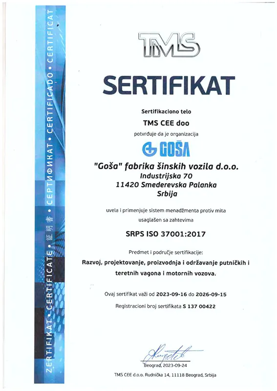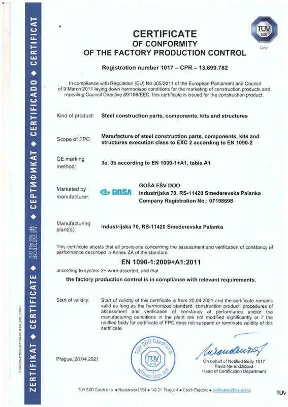 Od 1996. godine fabrika poseduje sistem kvaliteta ISO 9001, a svi procesi zavarivanja su sertifikovani po evropskim standardima za šta fabrika poseduje odobrenja dobijena od srpskih i slovačkih železnica.